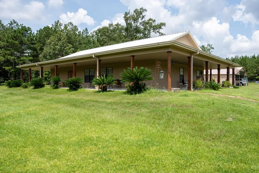 Offering a private country setting this attractive 20.15 acre highly improved property includes a 2,280 square foot home with open designed living/kitchen/dining area and wrap-around porches, a 30'x50'workshop on slab with full bath, numerous useful outbuildings, several fenced pastures for a few horses or livestock, a small seasonal creek, and mixed pines and hardwoods for wildlife viewing or hunting!