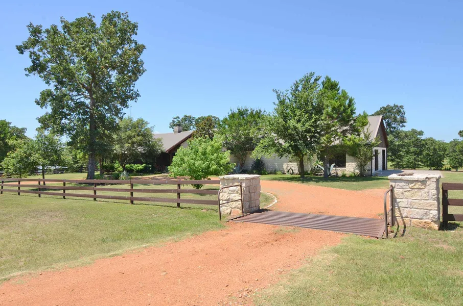 Country Living at its Finest! Custom home is the best of country life on 20 gorgeous acres w/ scattered oaks, coastal Bermuda, great for horses. Home boasts warm wood finishes, hard wood floors, wood beamed celings & custom cabinetry that blend perfectly w/ smooth granite, stone walls & accents. Extensive built-ins, bonus living spaces. Main house is 3BDR/2BA at 3677 sqft. Adorable 2 story country-chic cottage is 3BDR/1BA, 624 sq ft. Ponds, barns, panoramic views.