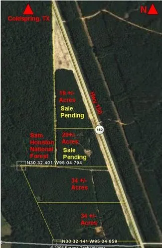 Excellent access and frontage on Hwy 150. Adjoins (19, 20, 34, 34 acres) the Sam Houston National Forest. Gently sloping sandy loam terrain mostly wooded in 10-12 year-old pine trees. Cleared along road frontage and north end of the 19 +/- acre tract. Excellent location for rural home site. No floodplain, good drainage, buffer by Sam Houston National Forest. Rare find! Great Investment! Clean, fresh air! SOME RESTRICTIONS APPLY TO BE DETERMINED! But basic, no commercial use, no subdivision, limited number of residences, etc...More to follow.