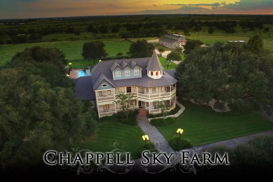 Approx. 20 hilltop acres located between Brenham and Chappell Hill offering magnificent 360 degree views of the surrounding countryside. Travel through the gated entrance up the tree lined driveway and past the pond with gazebo and pier to the stately three story stone home. The main home features 5 bedrooms, 4 baths, spacious living area, island kitchen with granite countertops, study with built-ins, fabulous master bedroom with fireplace and third floor bonus and lookout room. There are first and second floor wrap-around porches and a manicured yard with the pool, hot tub, small gazebo and beautiful landscaping. There are a total of 7 garage bays, 3 attached to the main house, and 4 below the 2/2 guest home. The horse barn features 6 stalls, tack room, wash room and underground drainage. The property is conveniently located within an hours commute to Houston making it the perfect weekend property or permanent residence!