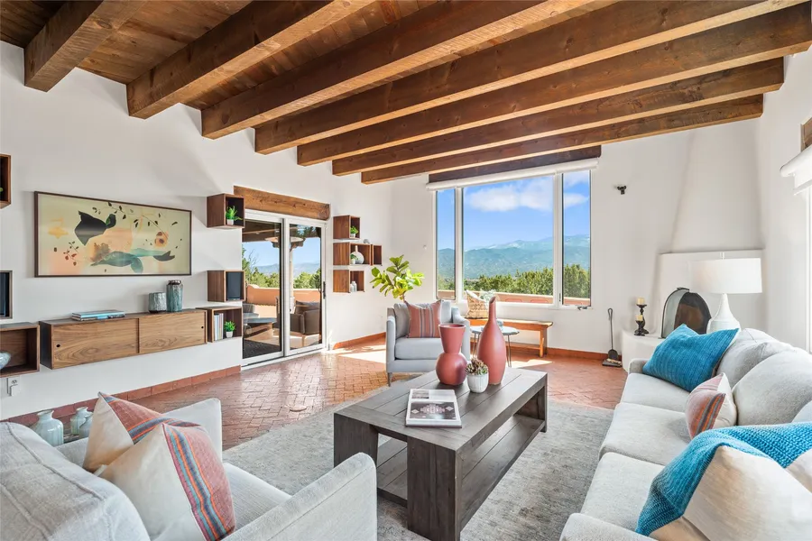 Breathtaking views and timeless Santa Fe charm converge in this enchanting light-filled Pueblo Revival home, ideally situated on 2.5 private, wooded acres just minutes from the historic Santa Fe Plaza. With panoramic vistas of the Sangre de Cristo Mountains, this single story 4-bedroom, 3.5-bath residence offers a rare combination of serenity, style, and location. At the heart of the home, the open-concept chef’s kitchen—fully rebuilt in 2023—flows beautifully into the dining and living spaces, anchored by a massive picture window that captures the ever-changing mountain light. Outfitted with top-tier appliances by Wolf, Thermador, and KitchenAid, the kitchen features hand-glazed brick backsplash, premium granite countertops, abundant knotty alder cabinetry, clever under-counter storage solutions, and a oversized walk-in pantry. The four spacious bedrooms include two luxurious primary suites, each with a private full bath. These suites, along with the den, living room, and dining room, open directly onto a generously scaled patio, offering spectacular indoor/outdoor living with sweeping views of the Sangre de Cristos—a true extension of the interior space and an entertainer’s dream. The patio features a covered portal, dining area, hot tub, and fire pit. Inside, classic Santa Fe design elements abound: two kiva fireplaces, exposed beams and vigas, ample skylights, brick flooring, decorative tile work and built-in bookcases lend warmth and regional authenticity to every room. The layout balances openness with privacy, including a separately located owner’s suite with dual walk-in closets and stunning mountain views. Creative pursuits find a natural home in the separate workshop/art studio/yoga room, while ample storage, including a large laundry room and an oversized two-car garage, ensures functionality matches beauty. A beautiful home office space with large windows provides additional options for working from home, a home gym, or can be used as a 5th bedroom
