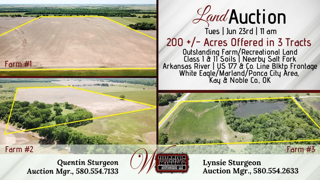 Farm #2 (80 +/- Acres): According to the Kay Co. F.S.A., there are 70.36 acres of cropland with a full wheat base & 34 bu./ac. yield. Principal soil type of the cropland is Keokuk very fine sandy loam, Class II (70%), with lesser amounts of Keokuk very fine sandy loam, Class I & Gaddy loamy fine sand, Class III. Cropland lays level & is easily tilled. Balance of the land is in an approx. 4.88 acre pit, comprised of native grass & timber along the river, providing excellent hunting potential. Legal: The S/2 SE/4 of 32-25N-2E, Kay Co., OK 19 Taxes: were approx. $198.00.