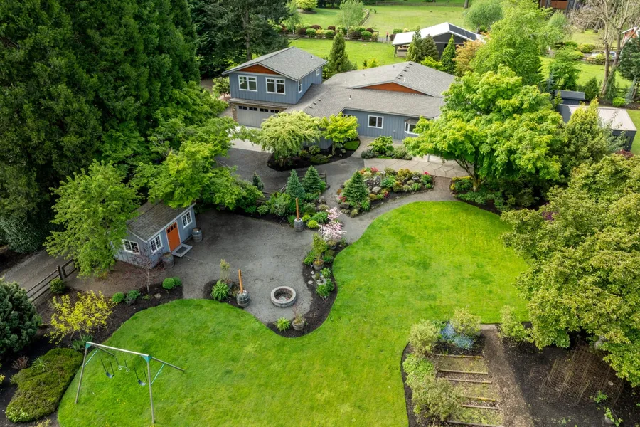 Nestled in one of West Linn's most esteemed neighborhoods, 200 Peach Cove Lane offers an unparalleled sanctuary, just moments away from the Oregon Golf Club, Hebb Park, and the enchanting West Linn wine country. Set upon a park-like acre of land, the approach to this residence is nothing short of enchanting, with a tree-lined driveway welcoming you to your private retreat. Immersed in the beauty of nature, the extensive landscaping surrounding the home sets the stage for serene relaxation, while a spacious lawn with a studio provides the perfect backdrop for entertaining guests. This 5-bedroom, 4-bathroom home has been thoughtfully updated to cater to discerning buyers seeking the epitome of custom home living. Step inside to discover a remodeled kitchen and walk-in pantry, alongside newer additions including two bedrooms above the garage. Modern comforts abound, including a tankless hot water heater, water treatment system, storage sheds, and ample space for RV or boat parking. Upon entering the grand foyer, natural light floods the home, highlighting the meticulous attention to detail evident in every corner. The kitchen effortlessly flows into the adjoining sitting and dining areas, creating an ideal space for hosting large gatherings. Continuing into the great room, access to covered outdoor space beckons, offering the perfect venue for barbecues or leisurely evenings spent under the stars. The coveted primary suite on the main level boasts a luxurious spa-like bathroom and expansive windows adorned with plantation blinds, providing both privacy and breathtaking views of the backyard.Two additional rooms on the main floor, along with two more upstairs, offer endless possibilities for living arrangements. Experience the ultimate in relaxation and luxury at this exceptional property, where every day feels like a vacation. Welcome home to 200 Peach Cove Lane!