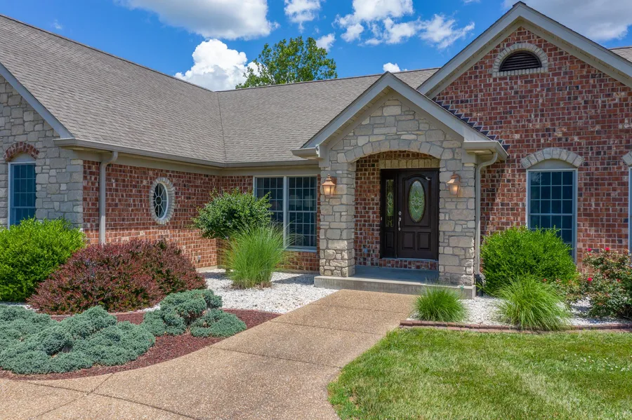 ustom Atrium Ranch on 3.4+/- Acres with over 4,000 sf of living space. This home features an all brick & stone front, circle drive, professional landscaped yard with accent lighting. Walk into the front door of this 4 bed/4.5 bath home and be welcomed to large Great Room overlooking level backyard. Spacious kitchen features custom oak cabinetry, quarry tile, large center island & walk-in pantry with glass etched door. All Seasons Multi-Purpose Room is surrounded by windows that also overlooks the back yard. Large master bedroom vaulted ceilings & adjoining master bath with Jacuzzi tub & separate shower. Main floor laundry room with custom built storage. Finished lower level features large living area, 2 bedrooms with Jack/Jill bath, 3rd bed with separate full bath & zoned HVAC. Massive 3,000 sf attached garage can accommodate 5 cars on main level and includes 840 sf bonus room. Additional 1-2 car drive-under garage at back of home. Small shed with electric & water at back of property. For additional information, please contact Bobbie Caruthers at 636-358-7906.