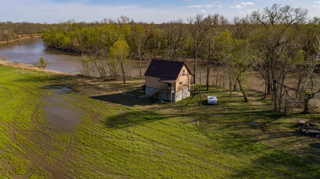 SPORTSMAN'S PARADISE!!!!! Here's your opportunity to own your own pennisula surrounded by the Verdigris River on 3 sides. This property has 3 areas that have been designed for flooding in order to duck hunt. Abundance of deer & turkey to hunt as well as fishing on this major river. Productive soils for corn, milo, soybeans & wheat. 73 acres are tillable & the balance is mature timber on the river. 2 story structure, cabin upstairs, concrete garage at ground level. Tennant available to farm.