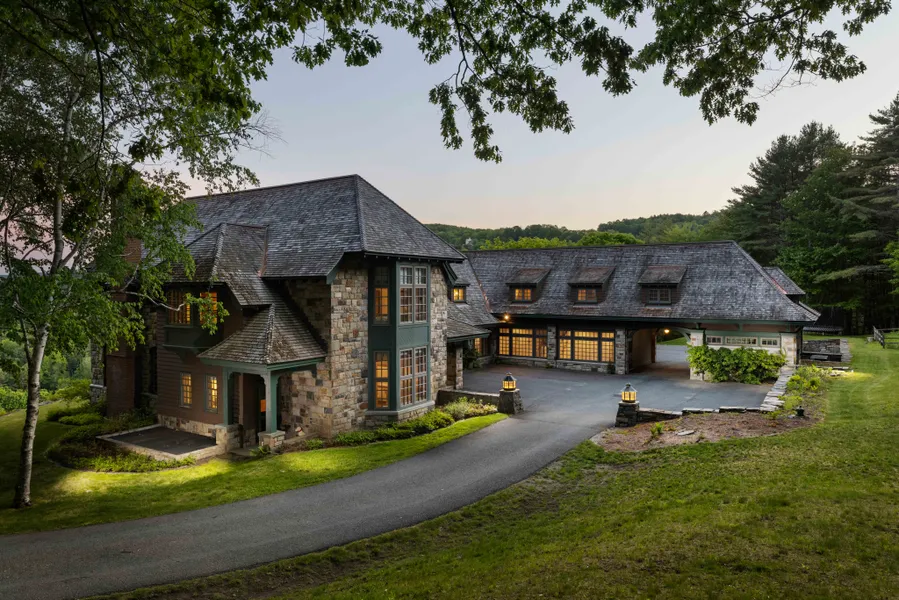 Set high along the top of a south-facing ridge, the Vermont countryside unfolds at your feet with commanding views across the Ottaquechee Valley to Mount Ascutney. Copious fenestration on the south walls takes full advantage of the direct southern exposure. Constructed in the tradition of old-world craftsmanship, this incomparable stone and cedar estate features the finest quality materials and decorative finishes throughout. The approximately 9,000 square foot, 15-room residence is an elegant and timeless design in richly textured stone, expansive glass, and mahogany details. The main house offers seven bedrooms, nine baths, a recently remodeled gourmet kitchen, formal living, and dining rooms, 3,200 bottle wine cellar, and presides over a pond-like, heated swimming pool surrounded by bluestone terraces. Its enduring and harmonious design is heavily influenced by the original home of U.S. Steel founder Edmund C. Converse's Conyers Farm in Greenwich, CT.