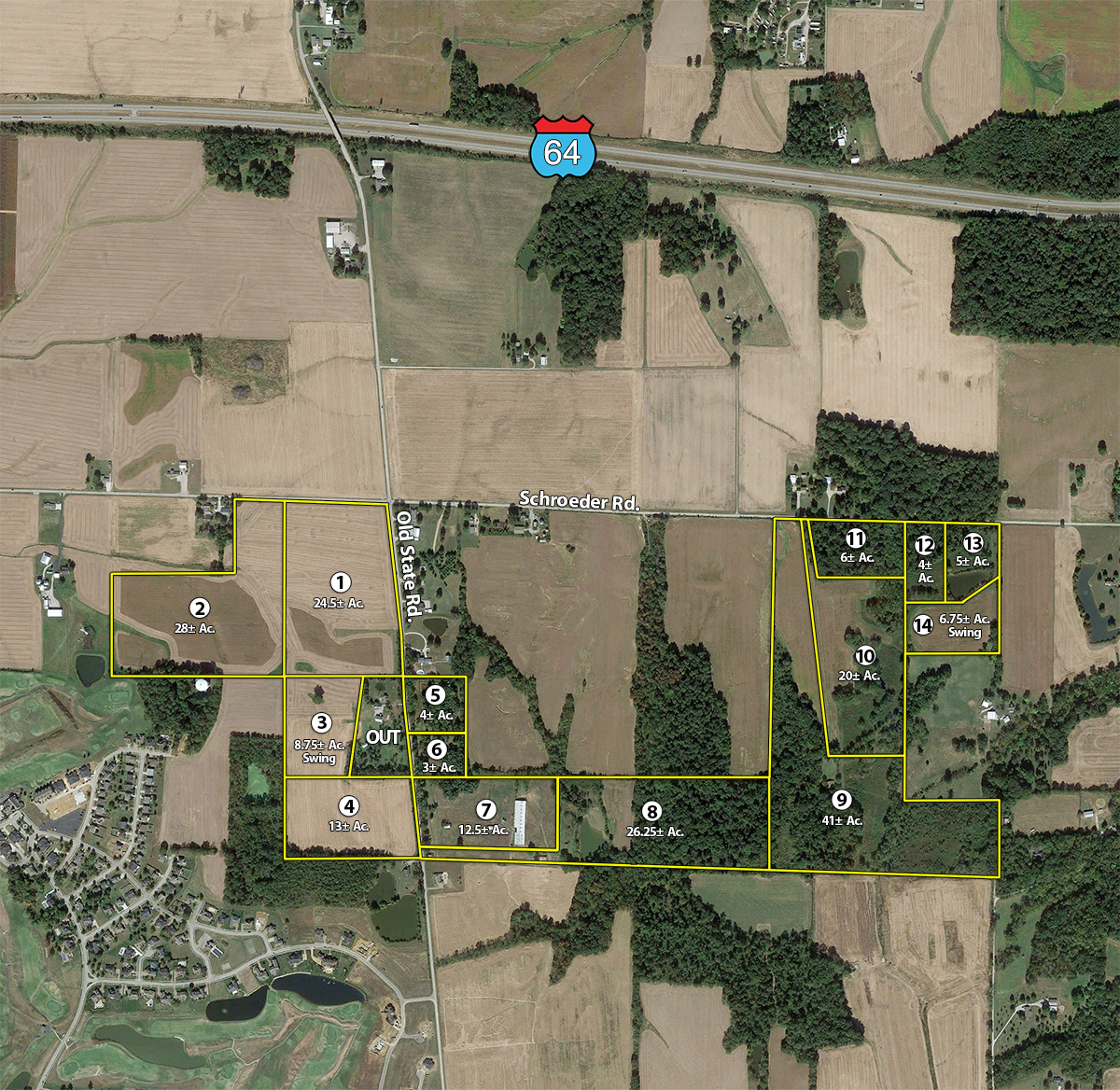 FOR THE FARMLAND BUYER: Tracts 1-4, 9, 10, 14 offer 94+/- tillable acres in total with good productive soils and are easily accessed for transport to grain terminals. Tracts 1-4 offer 74+/- contiguous tillable acres at the southwest corner of Old State and Schroeder Roads and ample road frontage.