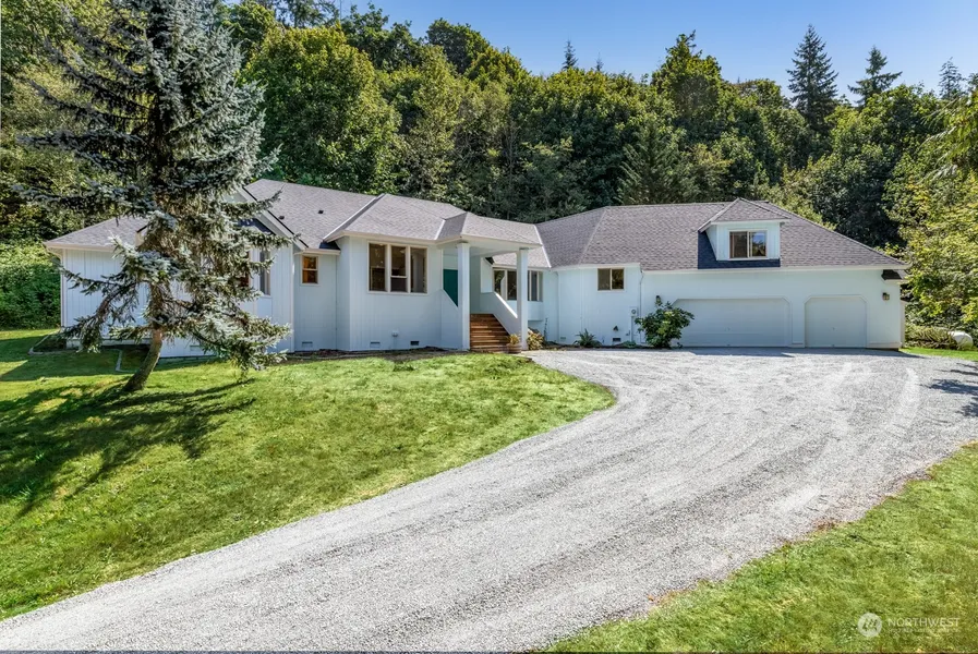 Well laid out elegant home on a VERY PRIVATE 8 acres. Beautiful large,1728 sq.ft. barn w/4 stalls, shop/tack room. Built with care to details including just refinished inlaid hardwood floors, big primary bath with 2sinks,Door to separate yard area from primary.2 sided fireplace between the living room & family room.3 car garage with a huge bonus room over it. Spacious kitchen offers an eating bar & lots of cabinets, brand new cook top & garbage disposal. New hot water tank. The kitchen is open to the eating area with French doors leading to the freshly painted back deck & very private yard. Convenient large formal dining room, den/office off the kitchen. Brand New Roof too! Do NOT follow google directions! Go straight up hill at mailboxes.
