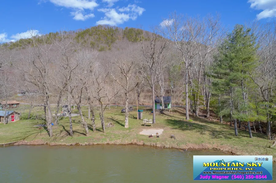 This is a unique property it has the original TINY HOUSE concept with sleeping loft and the open area below with a flue for a small wood stove (this one in the picture does not stay) and native stone chimney and open deck around a large tree This is just so special. The land is rolling with this house on the back knoll small branch on the left side and New River Frontage across from the New River Trail, the land has a well and electric in place (these items will be completed by the seller in the future) nice easy access to the waterfront, good fishing and views. water depth about 4+ feet I think the owner said. There is also a concrete pad for the picnic table to sit on near the water. Come make this a summer playground.