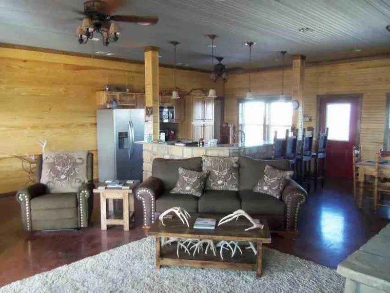208+/- acre high fence with a beautiful stone house, 2/2/cp, 1500 sf, completed in December 2012. The house has a covered porch on 3 sides with TV mounted on the back porch, Open concept, 2 large bedrooms, 1 on each end of the house, master bedroom has tile stand alone shower with marble his and her sinks, stone fireplace and bar with marble top, nice cabinets, utility room. Stained concrete floors