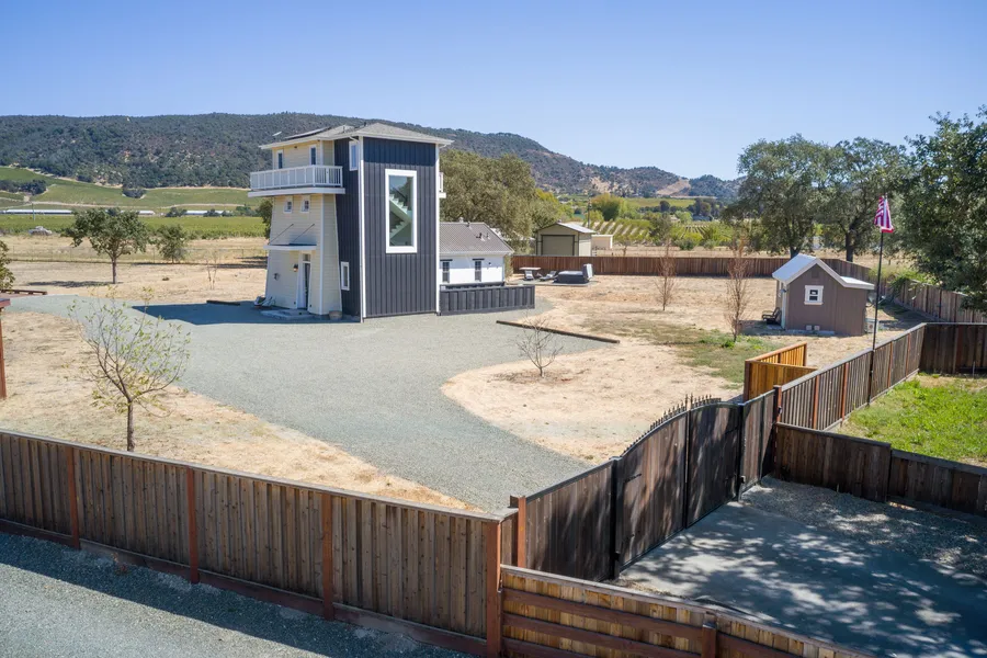 Architecturally stunning nearly new 2 bd/1 full ba & 2 half ba residence in the desirable Hyde/Burndale neighborhood. Industrial American meets English farmhouse. Three floors in height & topped w/wrap around lookout w/360 degree views of postcard perfect views of rolling hills, vineyards, & City lights in the distance. A peaceful & private location in prime Carneros, it is just moments to the historic Sonoma Plaza & downtown Napa...& only 45 minutes north of the Golden Gate so it is the closest location in the Valley for getting to Marin & San Francisco. Built by a professional designer, the choices of materials are of the highest quality & they show a designer's flair. Interior features include hardwood floors, oversized windows blurring the lines between indoors & out, Chef's dream kitchen w/commercial grade appliances, & fireplace. Outdoor entertaining under the stars w/hot tub & fireplace. Though living like a 2 bd residence it is called a 1 ba + den so this allows for 2 more bd in any additional structures a future owner may wish to construct. Site plan approved & still active until next year for the 640 square foot ADU w/142 sq ft covered porch. Plans for swimming pool. Charming creek. A property with so many options & upside