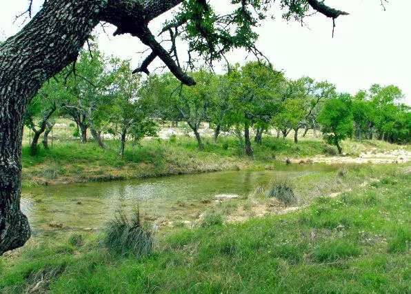 Ranch features lush pastures with large majestic trees, Towhead Creek flows across tract, water well, meter loop hookup (ready to build), view of lake, private paved roads, security gates, Wildlife Exempt, large stocked community lake, most cedar cleared, no mobile homes. Owner/Agent.