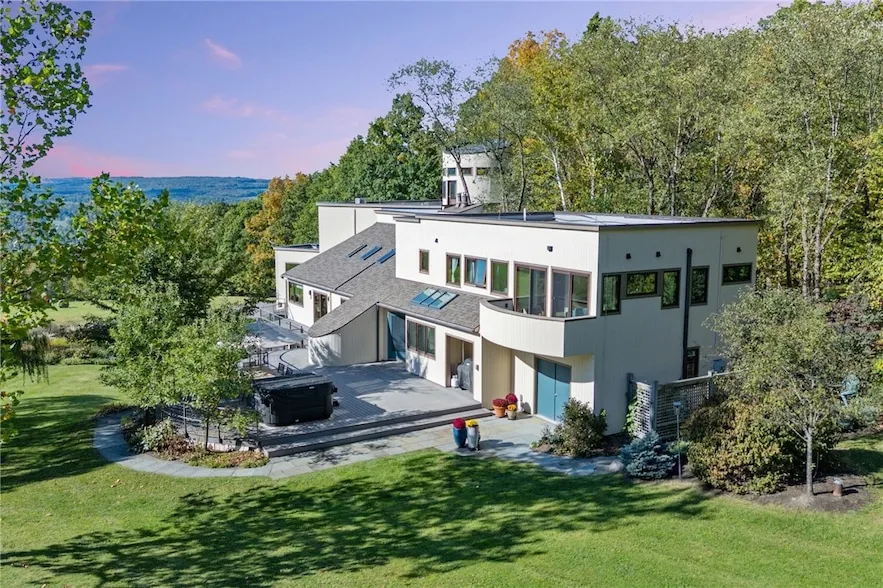 Prepare to be awed in this newly renovated contemporary home. Experience unparalleled indoor-outdoor living with panoramic views on 21+ acres! The stunning living room, with its dramatic wall of windows, is the ultimate space for entertaining. At the heart of the home is the newly renovated, sun-filled chef's dream kitchen, featuring Bosch and Subzero appliances, a gorgeous granite island, soaring cathedral ceilings & a cozy den. The home boasts miles of custom-built bookcases, a charming circular library, and a turret study, plus a gym, sunroom, game room, and potting room. The luxurious primary suite includes separate his-and-her lavatories, a soaking tub and a custom walk in closet! A private studio apartment is ideal for guests, in-laws, or an au pair. Enjoy the expansive yard filled with gardens, serene meadows, and surrounding woods. Bordering The Finger Lakes Trails, walk to Butte...