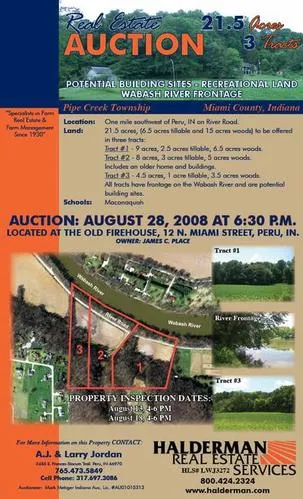 21.5 Acres (6.5 tillable, 15.0 wooded)to be offered in three tracts. Tract #2 has older house and two sheds. All tracts have Wabash River frontage. Great potential building sites, wooded and river frontage.