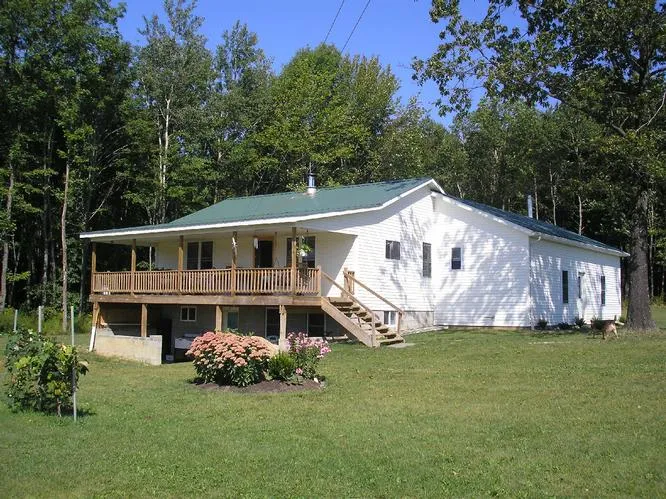 Newer Construction Secluded, way-off-the-road 21.83 acre hunting or nature-lovers resort built in 2009. Pure peace and solitude! 2 bedrooms, one bath, kitchen w/ pantry, 26x15 great room, living room, dining room, 10x28 wooden deck, full basement annexed to 10x27 concrete patio. Massive 42.5x30 pole building and 8x12 shed. MLS 94230