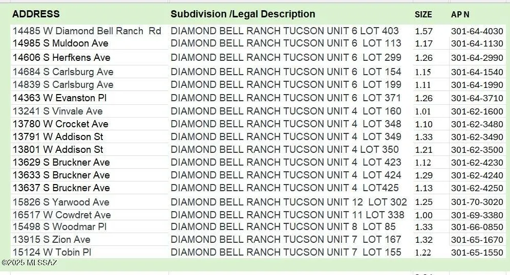 Bulk sale - 18 individual 1+ acre parcels in the scenic Diamond Bell Ranch neighborhood! Parcels: 301-64-4030, 301-64-1130, 301-64-2990, 301-64-1540, 301-64-1990, 301-64-3710, 301-62-1600, 301-62-3480, 301-62-3490, 301-62-3500, 301-62-4230, 301-62-4240, 301-62-4250, 301-70-3020, 301-69-3380, 301-66-0850, 301-65-1670, 301-65-1550. Just 25 min to Tucson! Gorgeous mountain views, desert landscapes, stunning sunrises and sunsets. No HOA, horses allowed! Zoned CR-1: site-built homes only; RVs or mobile homes may be allowed with build permit. Water/electric slowly expanding. Seller requires bulk sale. Check out my other DBR listings.