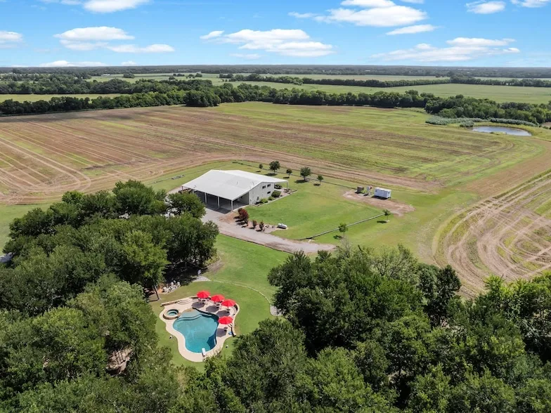 Private Barndo Retreat on 21 Acres with Pool, Shop, and Pond See notes below about dividing property Discover the perfect blend of modern barndo living and wide-open Texas freedom on this incredible 21-acre property! Nestled well off the county road for ultimate privacy, this 1,600 sq ft 2-story barndominium offers peace, comfort, and serious potential. With 1 bedroom and 2 full bathrooms, this thoughtfully designed home is as functional as it is inviting. Inside, you ll find custom handcrafted pine cabinetry, durable stained concrete floors downstairs, plush carpet in the upstairs bedroom, and a tankless water heater for on-demand efficiency. Step outside and experience your very own resort-style paradise:Front and back covered porches to soak in the views In-ground saltwater pool with lights, outlets, and a nearby fire pit Stocked pond that is sealed with bentonite great for for fishing and fun10,000-gallon cistern collects rainwater for your sprinkler systemAg exemption in place for lower taxes Some fencing already installed for livestock or securityThe 2,400 sq ft insulated shop is a showstopper all on its own featuring 4 overhead doors, built-in shelving, and plenty of space to expand your living quarters. It also includes a 12x20 safe room with electricity, AC, and internet ideal as a storm shelter, home office, or secure storage. Whether you're looking for a homestead, hunting getaway, or private sanctuary with room to grow, this one-of-a-kind property has it all. Property Being sold as home with shop on 21 acres Additional acreage for sale separately for a possible total of 95 acres Call listing Agent for map of proposed division of tracts. This property is part of a large tract of land being sold as all 95 acres with barndo ,shop and pool or divided outDon t miss your chance schedule your private tour today!