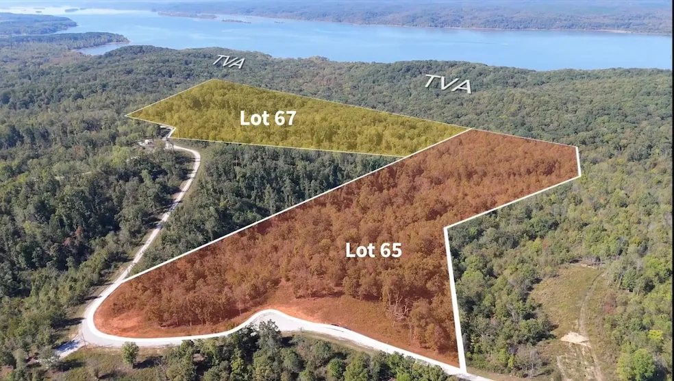 Two contiguous estate parcels totaling approximately 39 acres overlook the Tennessee River and Kentucky Lake, with nearly 1,670 feet bordering TVA reserve land to help preserve natural views and privacy. Offered as two separate lots, Lot 65 (MLS 3017176, $199,900) includes 21 acres, a meandering creek, about 840 feet of road frontage, and multiple elevated build sites with potential lake views. Lot 67 (MLS 3017180, $199,900) offers 18 acres, about 459 feet of frontage, rolling wooded terrain, and close proximity to the shoreline, with additional high points for future building plans. Electricity is available at the road, and will need a private well and septic system. Maintained gravel roads are supported by a $1,000 annual road association, with no HOA beyond road maintenance. Only restriction noted: No mobile homes, or manufactured homes built under federal mobile home regulations shall be allowed on any lot; a copy of restrictions is provided in MLS or can be sent upon request. No restrictions on hunting are stated. Purchase either lot, or combine both parcels for a single, flexible landholding suited for a dream home, farming, recreation, or a private retreat. See link for video!!