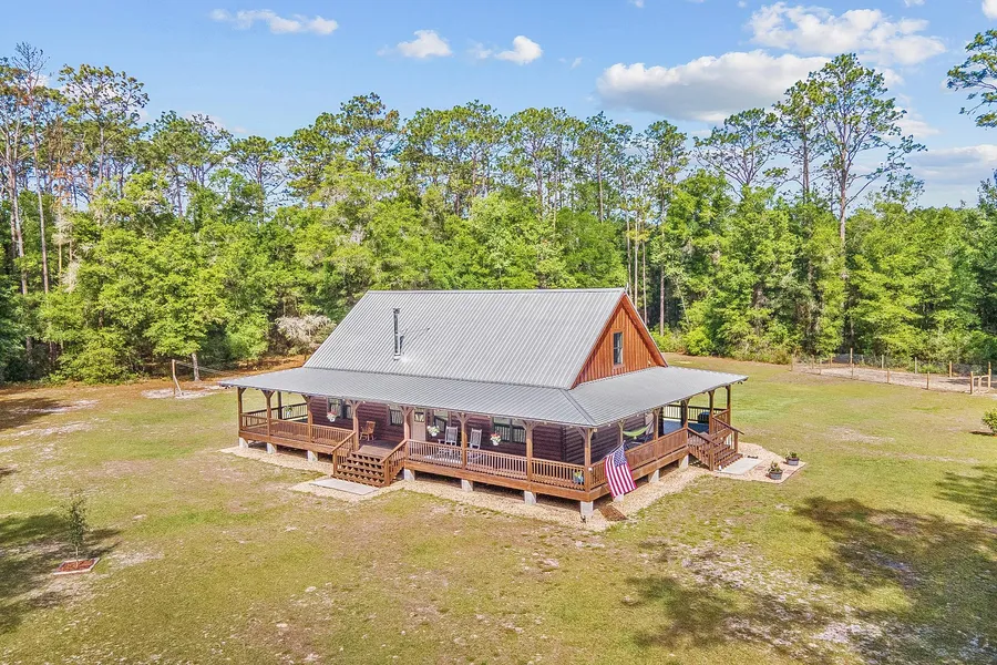CUSTOM BUILT CYPRESS LOG HOME FOR SALE! Take a scenic drive down the private, gated driveway where you'll find 21 gorgeous acres of prime country land. This log home was built in 2017 and boasts over 2,000 heated/cooled sq ft, with 3 large bedrooms and 2 full bathrooms. The vaulted tongue & groove wood ceilings, stained concrete floors and a wood burning stove will surely be the topic of conversation with their intricate beauty. Beautiful, spacious farmhouse style kitchen with concrete countertops and a eat-in bar complete the inside of this beautiful home. Outside you'll enjoy relaxing on the huge wrap around porch soaking up all the peaceful scenery on the property. Behind the home is a 48x36 pole barn complete with electricity, a 50-amp RV hookup, storage area, chicken coop and so much more! There's plenty of room for a garden in the back yard and there's also a shooting range to sharpen up your skills. Enjoy the abundance of wildlife on the property with numerous walking trails throughout. Enjoy an easy commute to nearby Ocala and Gainesville for work, entertainment and numerous hospital systems such as HCA, UF Health and The VA. Just 30 minutes to the World Equestrian Center for all the horse lovers. This home and property have so much to offer, you'll need to see it for yourself! Call today to tour!