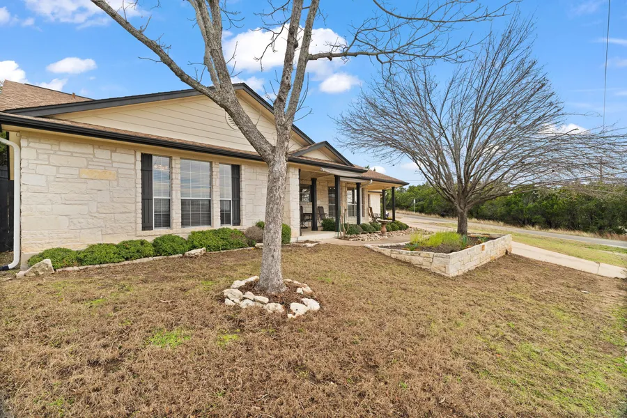 Charming single-story stone home featuring a welcoming front porch with scenic views and no direct neighbors behind or beside. Located across from a golf course, the home has recent updates, including fresh paint, LVP flooring in the living area with added insulation, bamboo floors in the primary bedroom, updated bathroom cabinets, new interior doors, light fixtures, ceiling fan, and backyard fencing. Additional features include a 2025 pump grinder, a Google Home Security system (with equipment), and appliances (fridge, washer/dryer). The backyard boasts an extended brick patio with a French drain. No carpet throughout the home.
