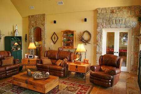 a new metal roof. A large living room with a 20 cathedral beamed ceiling, 20 wood burning sandstone fireplace, built-in stained hickory cabinetry complete with large tv, surround sound, tile floor and arched stone doorways. A beautiful kitchen with same tile floor, silestone (like granite) counter tops, large island with pot rack, eating bar with stone front, designer tile backsplash,KitchenAid, GE & Frigidaire stainless steel appliances and stained cabinetry. An adjoining breakfast room with tile floor and windows. The master bedroom is carpeted with bay windows and a step up ceiling. An adjoining master bathroom with a tile floor, jetted tub with above window and hidden tv, separate large glass & satin tile nickel framed shower, two marbled vanities and a large closet. Pretty foyer with an arched wooden front door surrounded by glass & wood. Dining room with tile floor. Game room with tile floor, step up ceiling & stone door ways. Study with carpet, three large windows and heavy textured walls. 2nd & 3rd bedrooms with carpet. Jack & Jill bath with separate vanities and tub / shower combination. The laundry has a tile floor, stained cabinetry and a stainless steel sink. A home detail sheet is supplied by the owner. Beautiful front and back covered stained concrete porches with tall stone columns and cathedral ceilings with cedar beam trusses. Beautiful pool with flagstone coping, aggregate decking and extensive landscaping. An all steel & stone concrete floored shop 30x50 with blown-in white foam insulation and an adjoining 20x50 overhang, stone front, two rollup doors and two windows. A beautiful rustic stone, wrought iron and cedar stave gated landscaped entry.