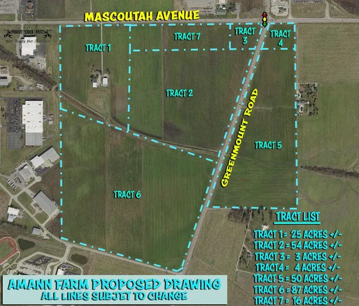 Public real estate and land auction is being held for the Estate of Paul J. & Deborah C. Amann. The property consists of 212.11 acres & 3 bedroom, 4 bath ranch home on a full, though unfinished basement & multiple multi-purpose out buildings. The acreage is in 3 parcels totaling 212.11+/- acres with 206.13+/- tillable acres available. The property is zoned light industrial within the City of Belleville'ss zoning jurisdiction and can be divided. There are approximately 9,409+/- Ft. of road frontage along Mascoutah Avenue and both sides of Greenmount Road. The 1,768+/- SF f home includes a large eat-in kitchen, a family room or office/den with a half bath, a living room & dining room on the main level. The unfinished basement has heated floors, a 3/4 bath, and offers plenty of room to finish for additional living space. The 4 outbuildings include a 60' x 115' machine shed with a dirt floor and 60 amp electric, a 50' x 40' workshop w/ 200 amp electric, a small smoke house, and last is a 60' x 50' multi-purpose barn separated into two sections. The first section is insulated and is hooked to propane & city water; there is also 100 amp electric service and a floor drain. The second section is simply open storage with lots of possibilities.