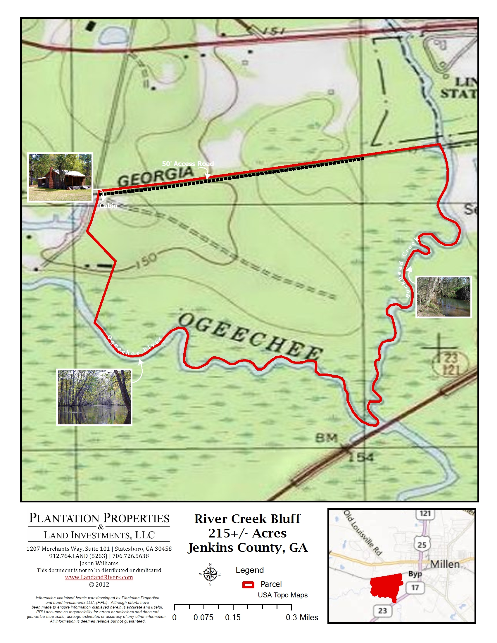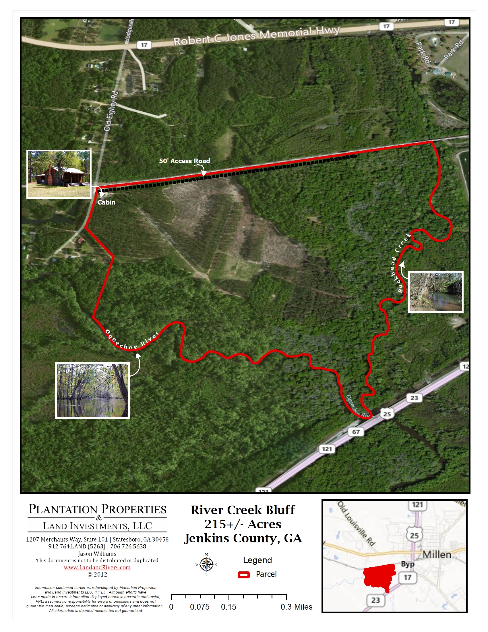 215+/- acres - River Creek Bluff is a unique property in that is situated where the historic Buckhead Creek flows into the pristine Ogeechee River. Abundant with wildlife such as deer, turkey, ducks and excellent freshwater river fishing. A Perfect multi-use property, that offers loads of opportunity. River Creek Bluff is 215+/- acres bordered to south by the Ogeechee River and to the east by Buckhead Creek. This tract features a charming small wood cabin perfect for weekend getaways or a hunting retreat, over 2 miles of water frontage with a boat landing and canal access to the Ogeechee River. The nice interior road system allows you to ramble through the beautiful hardwoods bottoms among the river and creek, and also see the large pine plantation and game food plots that have been planted in clover and wheat. River Creek Bluff is conveniently located close to the town of Millen, GA y...