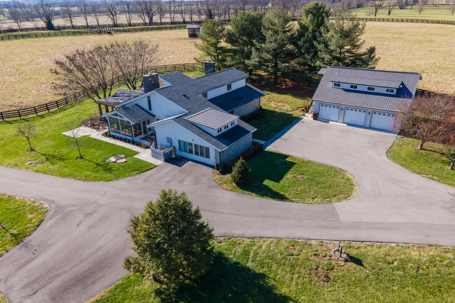 Expertly designed equestrian facility located along the highly sought after thoroughfare of Greenwich Pike. Totaling just over 22 acres makes this farm so easy to manage! The main residence has been beautifully renovated and totals 5 bedrooms and 3.5 bathrooms. Spacious open floor plan and views of the farm throughout. The primary bedroom is on the first floor along with a second guest bedroom. Alongside the house is a new oversized 3 car garage with a spacious apartment above. Enjoy entertaining in the covered outdoor patio area with a limestone surface and tongue and groove ceilings overlooking the entire farm! Reap the benefits of staying cool in the summer and warm in the winter while riding in a newly constructed indoor arena with 17 large sliding doors! The indoor riding area is approximately 100'x240' with fantastic footing. There is additional space inside the covered area to add eight 12'x12' permanent stalls. The main barn has 10 stalls and was updated in 2018 with a new roof and staff quarters above(1bed/1bath apartment and a 2bed/1bath apartment). There is a new 5-horse Kraft covered walker, along with equipment work shed with a 50 amp hook-up. Your horses will enjoy 6 large paddocks, 2 larger fields with automatic waterers. This property is located very close to the Kentucky Horse Park and Downtown Lexington. This property can also be purchased with the adjoining 10+ acre property.