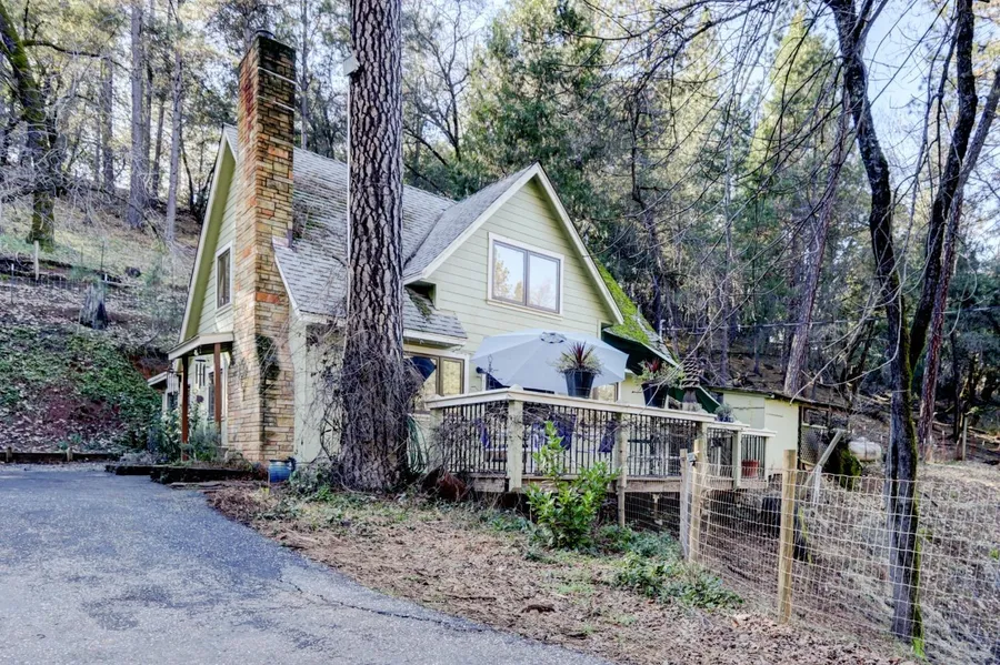 Charming home sitting on almost 22.5 acres with a seasonal creek that runs along the front of the property. Enter in the great room with lots of natural light, cozy woodburning stove, and luxury vinyl plank flooring that flows into the updated kitchen featuring quartz countertops and shaker cabinets, newer stainless-steel appliances, beautiful backsplash, panty and recessed lighting. Spacious updated tile bathrooms. Large attached great for BBQing, outdoor entertaining and enjoying the sounds of nature. Family room could easily be used as an office or game room. Upstairs you will find the remodeled bathroom with double sinks, walk-in shower, and stone tiled flooring. Primary bedroom is spacious and offers a sitting area as well as a nice size closet. Acreage allows room for all your toys and animals with a chicken coop, small barn, storage shed and detached three-car garage with guest quarters above. Perimeter fenced and cross fenced for all the animals! Come live the dream in Nevada County!
