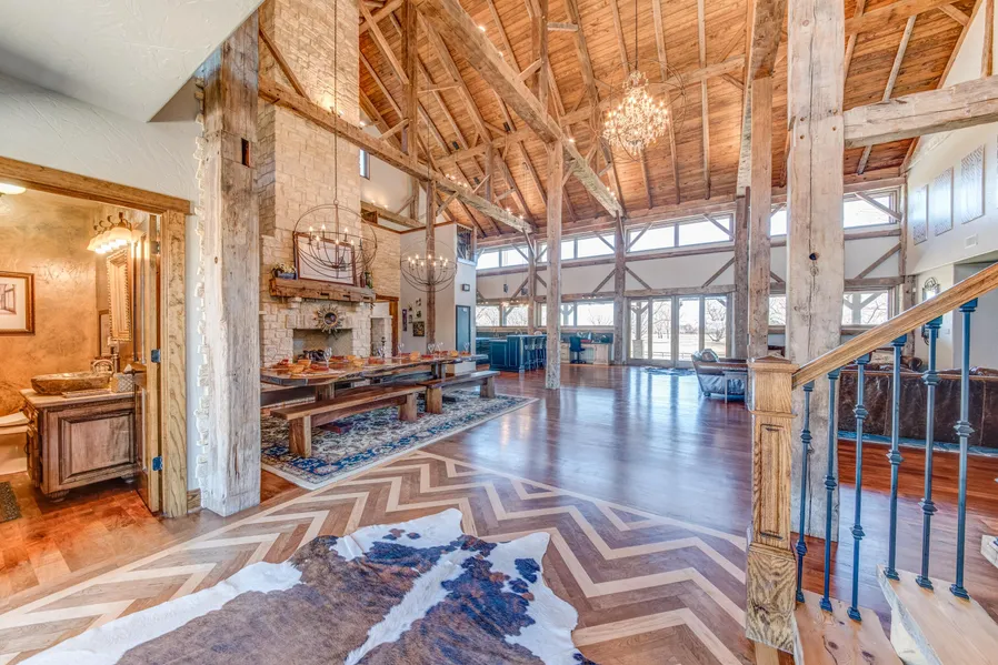 The estate also contains 1445 square feet of covered porches with living areas, full outdoor kitchen, fireplace and wood burning pizza oven. The master bedroom has its own private porch and balcony. There is also 1011 square feet of insulated garage space that houses the central vac system, an electric charging station for your electric car and one of two entries to the basement where all of the mechanicals are held. This home could be completely off grid with the addition of solar panels and battery storage as it has a rain water collection system that provides the potable water for the home. The water is collected off the roof and housed in a 20,000 gallon galvanized steel cistern with 2-stage filtration and UV sanitizer. Only 4-inches of rain fills the cistern. It also has a private well backup with water softener, although the sellers use the rainwater system for all of their water in the home including potable water. Continuing with the green building practices the home has three Geothermal HVAC units that are closed loops and located at the bottom of the pond. There are 3 Desuperheaters for domestic hot water, soft start, solar ready, electronic air filtration, 2 ERV units, air to air heat exchangers that discharge into the garage. This home is a SIP built home, which includes expanded polystyrene panels (not conventional construction), 6-inch panels on outer walls, 8-inch panels all roof areas yield an exceptionally high R-Factor. Additionally, every opening and seam has been foam filled. This structure is exceptionally tight and well insulated. The home has double pane, argon filled, low E windows. The metal roof is standing seam with no exposed fasteners. There is an underground propane tank, pre-plumbed for a future generator. The crawlspace/basement was built by bringing in dirt as this basement is not below normal grade. It is insulated and air conditioned with access from the garage and the wine cellar for storm/tornado protection. The foundation is an engineering feat with 250 yards of reinforced concrete, 52 bell-bottom piers (12'), 30 inch beams, 5" slab, 4"x12" shep tube columns beneath each Hemlock support post. In the wet areas you will notice natural stone tile and marble throughout and all sinks are stone. There are two staircases in the home and the staircase in the great room is Hemlock timbers. At the top of the great room stairs you will notice built ins and a ladder to the third story which is a crow's nest/playroom/office area. There is an interior oversized wood burning fireplace as well as an exterior fireplace with pizza oven.