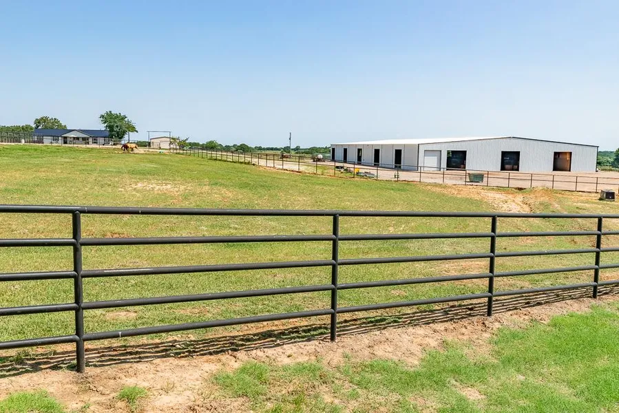 IMPROVEMENTS: Horse barn (135x250) with 2' concrete curb, sixteen 16' pillars, and 125x130 asphalt base. Sixteen 14x14 openings for ventilation. Arena: 125x120; round pen: 32 with 3 access points. Includes 20 stalls (12x13) with rubber mats, frost-free water, and convertible center gates to 12x26. Timed lights above each stall. 20x32 tack room with 3 rotating walls, decked viewing porch above, and guest bath. Also: 60 Priefert walker, 17x25 shavings room, 15x20 wash rack with hot water and breeding stock. 60% finished apartment with master suite, living/kitchen area, and 3 more bedrooms plus bath upstairs with barn-view balcony. 2700 of 5-rail pipe fence, frost-free bibs, 24x12 loafing shed, and 40x20 hay barn.