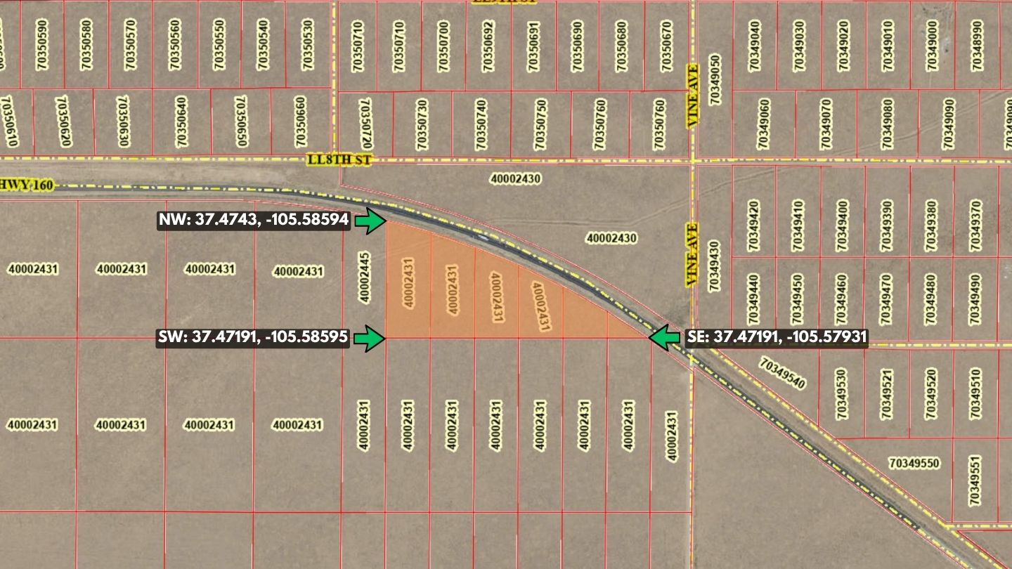 Research Parcel InformationTo visit this 22.66-acre lot for sale in Costilla CO, search Lots A02-A07, U.S. Highway 160, Blanca, Colorado, 81123 within Costilla County on your phone. When you are near the land, search 37.4743, -105.58594 on Google Map to locate one of the corners. Contact our office for surveys (if available), county plat maps, Google Map boundaries and corners, and MapRight.