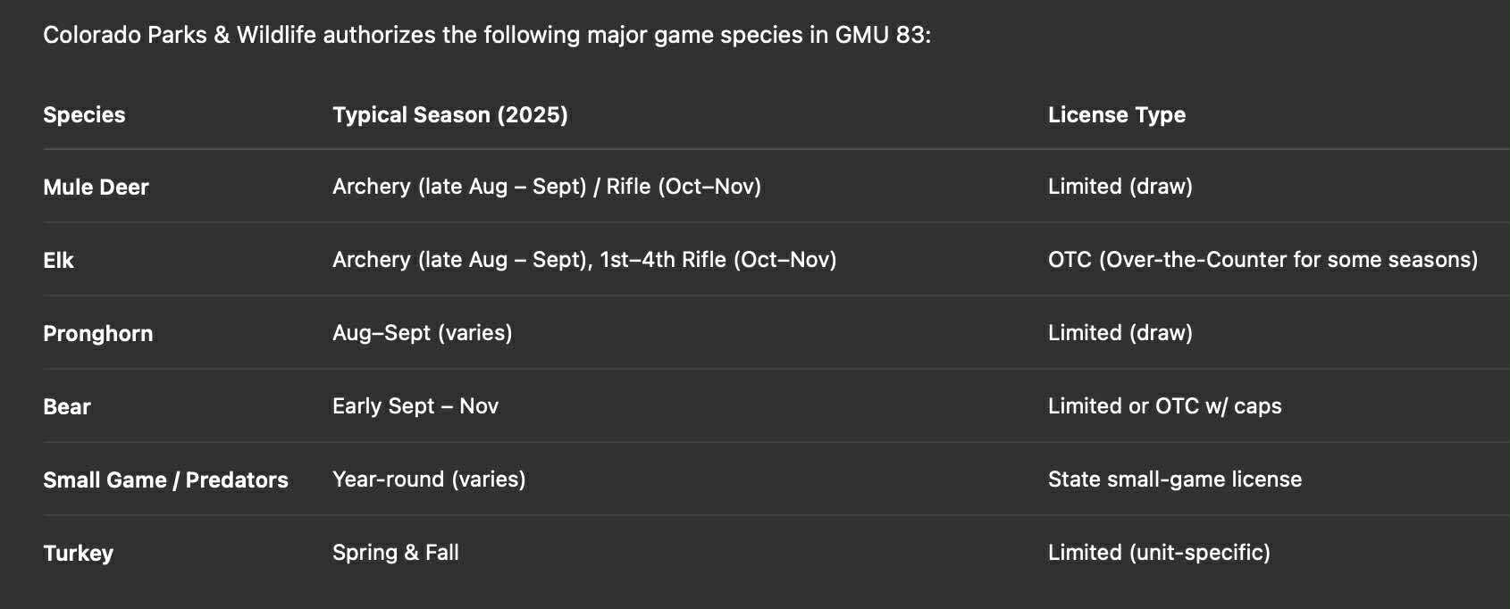 Trinchera Colony is a part of Colorado Game Management Unit 83, permits hunting of Mule Deer, Elk, Pronghorn, Turkey, and Small Game during various seasons throughout the year.