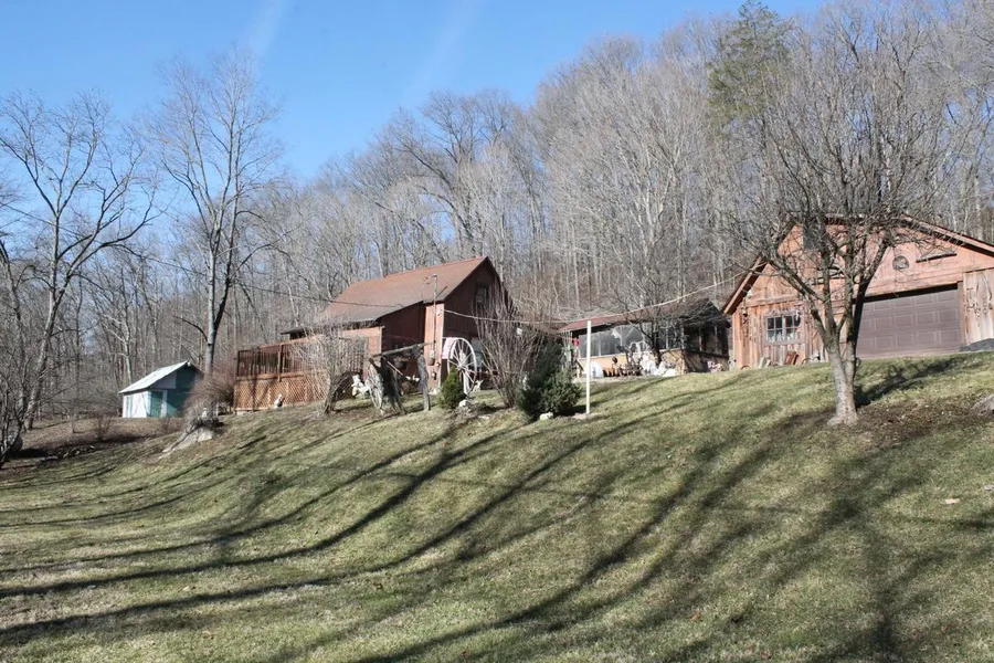 Looking for plenty of outbuildings and outdoor spots for relaxation? Cash buyer or land financing as house is not able to be financed. Possible tear down. Kitchen is loaded with cabinets and counter space including center island/breakfast bar. Separate dining room. Bedroom & full bath on main level. Upstairs has a long room for office/playroom and 2nd bedroom. Large covered deck plus open front deck. Detached screened summer house. Det. 1 car garage, pole barn & workshop. 22 acres.