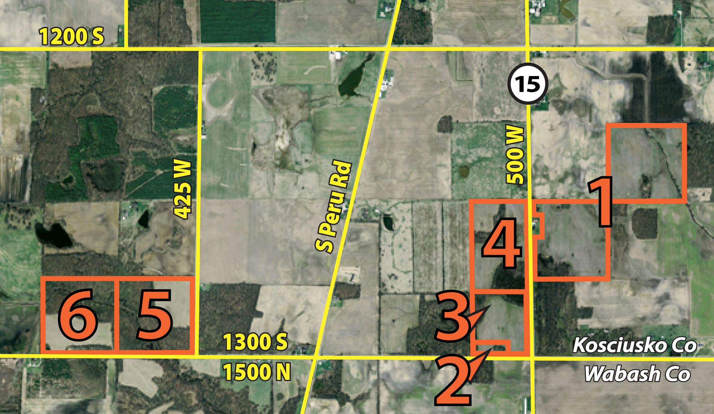 LOCATION: Tracts 1-4 are 1.5 miles south of Silver Lake, IN on Hwy 15. Tracts 5-6 are on CR 1300 S (County Line Rd) at the intersection of CR 425 W.