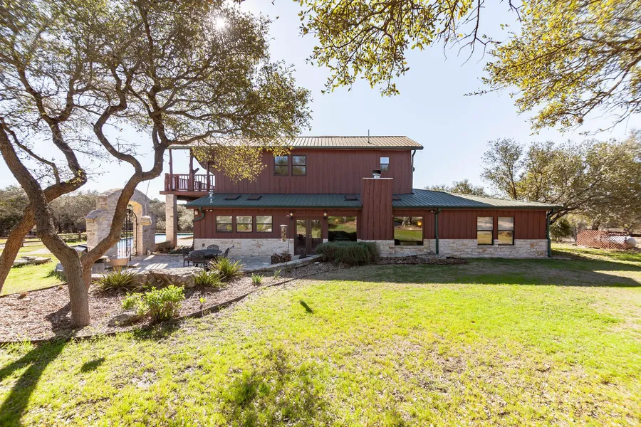 Let Nature Surround You! Stunning Hill Country home on 13 acres with 3232sqft main house, 1632sqft guest house plus 4 stall barn with tack room & detached 4 car garage/workshop. Both homes on the property are completely updated with high end finish-out including hardwood floors, exposed beams, Thermadore oven & microwave, granite, custom cabinets, quality fixtures & so much more. Vacation backyard with heated lap pool & spa, multiple decks with views & mature oaks. Great horse property, round pens convey.