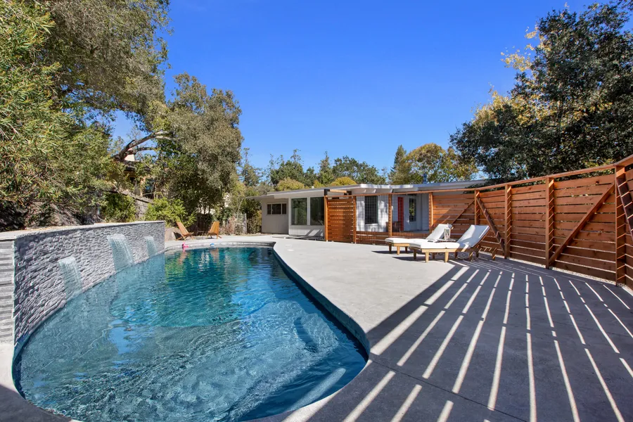 Midcentury home located in the heart of Rincon Valley, on the cusp of Fountaingrove, within walking distance to top-rated schools, elementary through to high school. Five bedroom, 2.5 bathroom move-in ready, modern open concept home that has been updated for today's living. Light and bright with lots of windows offering the benefits of passive solar. The main level features luxury plank floors, open beam ceilings, two bedrooms with one and a 1/2 bathrooms, a large kitchen with quartz countertops, upper-end soft close cabinets, and stainless steel appliances. Also, on the main level, you will enjoy the open concept space, which flows seamlessly for entertaining and leads to an expansive deck. The adjacent formal living room connects directly to a patio retreat, pool area, and garden shed/pool house. Downstairs, you will find a hall laundry closet with a full-size washer/dryer, three additional bedrooms with one full bathroom, a den with French doors, wine storage, and a utility room. There is a possibility of adding another full bathroom off the largest of the three downstairs bedrooms.