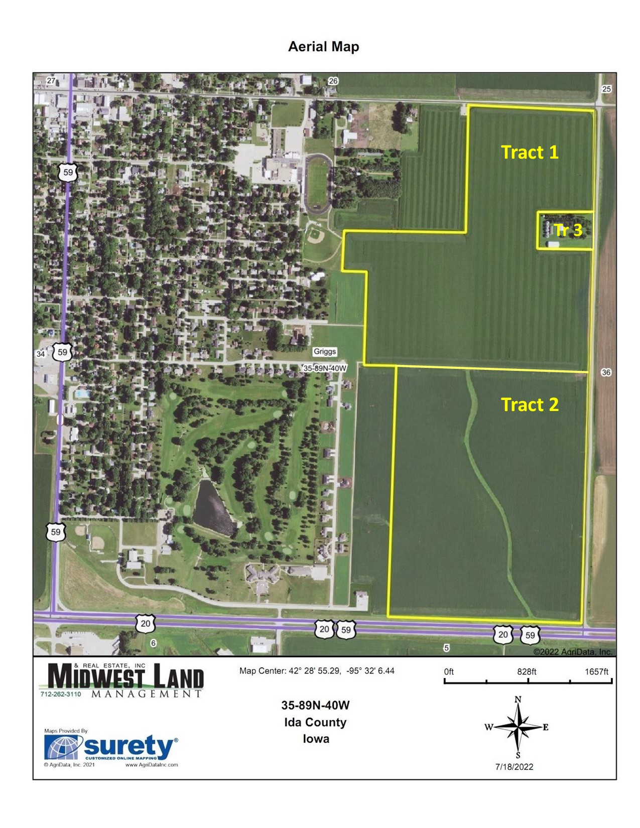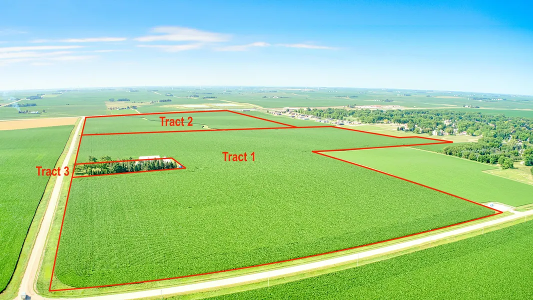 Tract 1 is 106.2 acres m/l and boasts a 95.5 Avg. CSR2 rating. Tract 2 is 112.98 acres m/l and features an 88.5 Avg. CSR2 rating. Tract 3 is a 4.17 acre acreage.