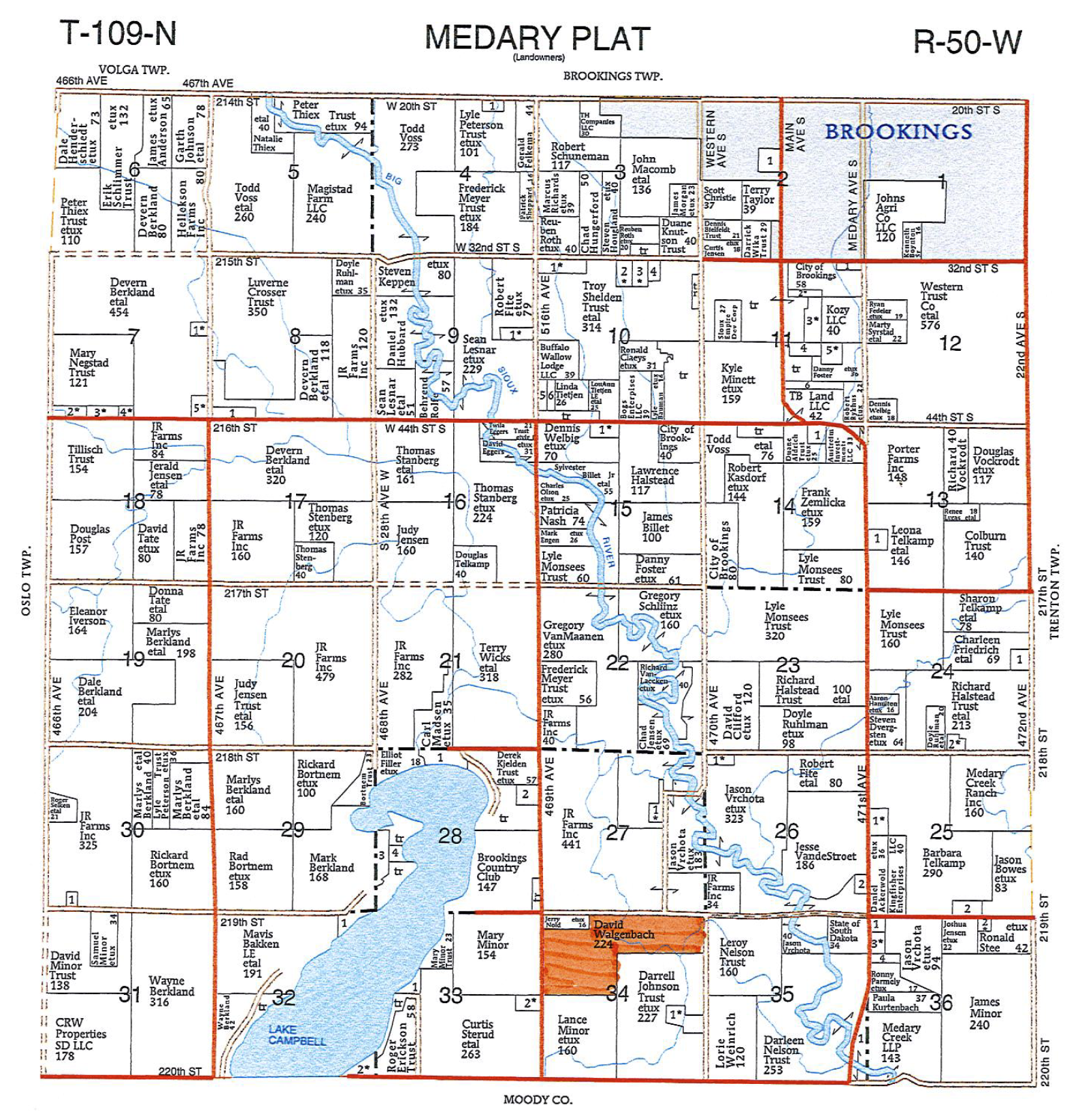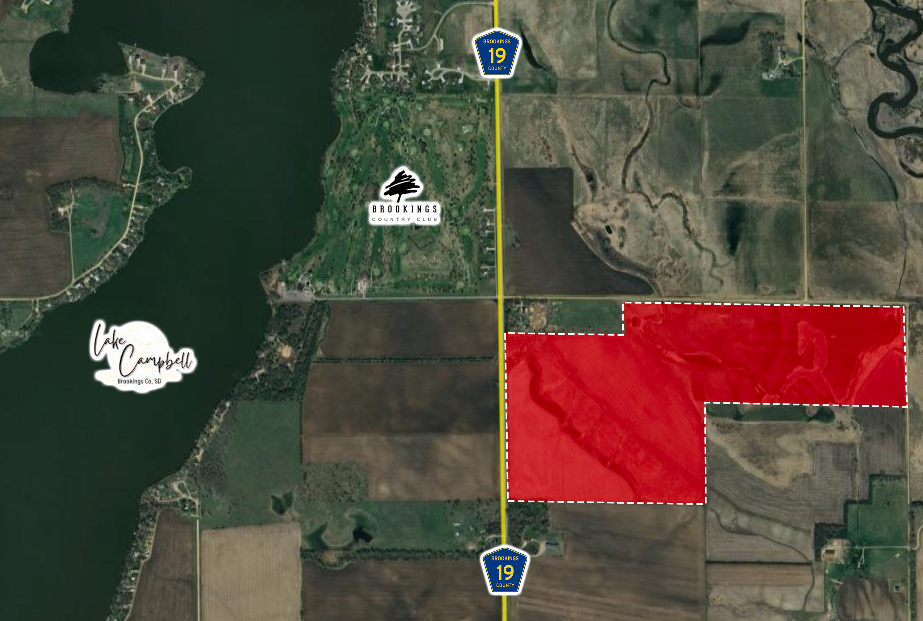 This highly attractive 224.47-acre farm is located on a paved road just south of Brookings, SD and within 1 mile of Lake Campbell and the Brookings County Club, showing an excellent location within a strong developed and agricultural region with long-term land demand and opportunities. 86.21 +/- Acres of Highly Productive, Tillable Farmland 31.82 + acres enrolled in CRP through 2030 with an annual payment of $137.70 per acre 38.43 +/- Acres Annually Cut for Hay 52.98 +/- Acres of Grassland Suitable for Hay Production or Grazing 9.18 +/- Acres of Mature & Scenic Trees 156.46 +/- Total Cropland Acres Per the FSA Office Per Surety Agri Data, the farm carries an average Soil Rating of 82 on the tillable acres, supporting strong yield potential with an annual corn and soybean rotation. The cropland and adjoining CRP acres sit up nice and high with highway frontage, and the land provides excellent cover with mature trees on a ridge overlooking grassland to the east, with the Lake and Golf Course less than a mile to the west! The additional land includes grassland and CRP acres that provide annual income, wildlife habitat, recreation, and conservation benefits. With its excellent location near Brookings and strong soil profile, this property offers exceptional appeal for row-crop operators, investors, or anyone seeking one of the finest parcels available to build the residential site of their dreams! Possession available at closing for this upcoming crop year! Description: NW Exc. N 431 of W 1570, N NE Sec. 34-109-50, Medary Twp., Brookings Co., SD - Record #120001095034200