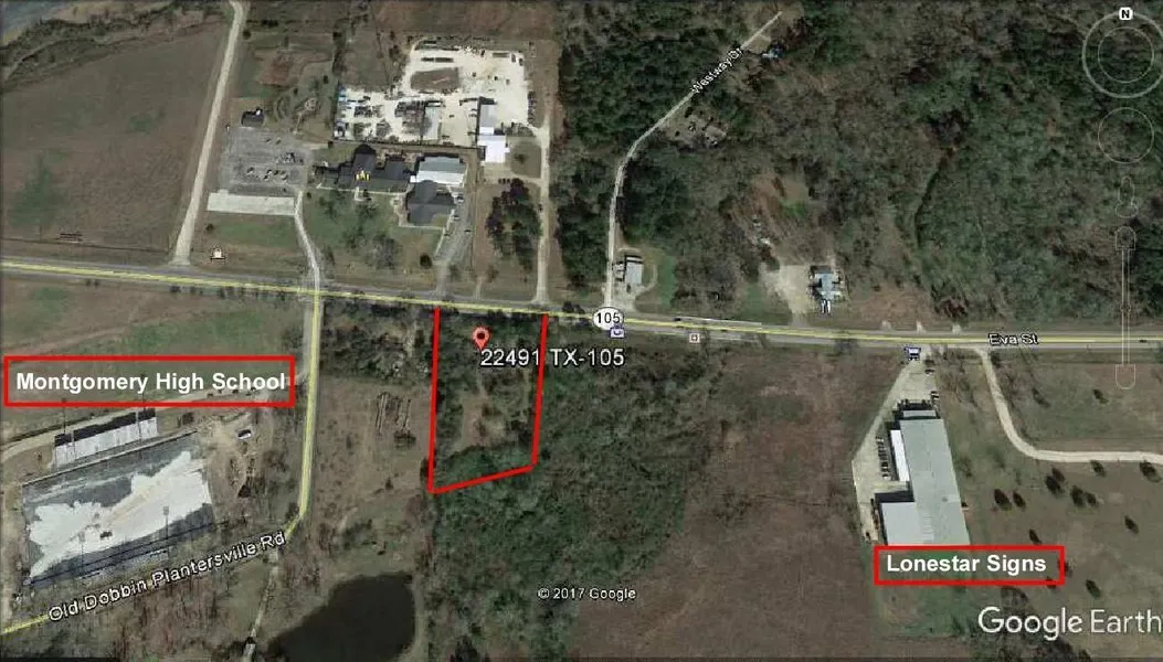 UNRESTRICTED! NOT IN CITY LIMITS! Great Location for Home or Business! Public Water & Sewer run across front of property along Hwy, seller never tied in -- Almost 2 acres on Hwy 105 West in Montgomery just east of High School. There is approx 215 feet of frontage with driveway onto Hwy 105. Tons of potential - Old Homestead and Slab removed, Garage slab remains but Seller would consider removing with acceptable offer - The plat featured below from Google Earth was before the lot was cleared.