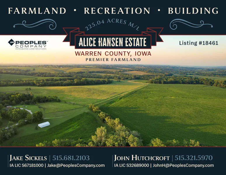 Peoples Company is proud to represent the Alice Joan Hansen Estate in the sale of 225.04 acres m/l of premium combination farmland, located in western Warren County, Iowa. Situated northeast of Martensdale and south of Norwalkjust five miles east of Interstate 35this farm has long been hidden behind the private gates at the end of Hempstead Place. Now, for the first time in decades, it is available to the public. The Hansen Farm presents an extraordinary opportunity to acquire productive agricultural land, except...