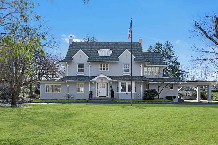 A rare find, almost 1.6-acre-level property. Good setback with circular driveway. This timeless, elegant home offers a center-hall marble foyer. Gracious living room w/fireplace, large window overlooking the private backyard. Formal dining room w/Bay window. An extra big office w/skylite & lots of windows, a marble fireplace, and French door exit to the patio. A nice room for working and relaxing. Gourmet kitchen with granite countertops. Open layout consisting of a 2-story great room, walls of windows, dual fireplace, outside entrance, mud room & powder room. 2 formal stairways access to the finished basement. The 2nd fl. features 4 bedrooms, 2 updated baths & a laundry Room. 3rd fl., the primary suite includes an updated bath, soaking tub, separate shower, and large closets. The lower level has finished Rec. rooms, Wine cellar, Bar, Sauna, office, full bath & laundry. This Charming home provided an in-ground pool and a tennis court. ( As is ) 2-car garage, carport, & storage.