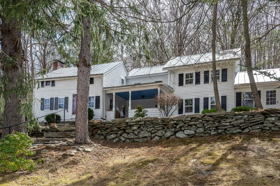 Nestled close to town, this captivating 1839 vintage home offers a unique blend of historical charm and modern functionality. The original eyebrow colonial features a first-level primary bedroom and a legal in-home office, complemented by wide board floors, original beams, and a striking stone and brick fireplace. A three-story barn, presenting an opportunity for a two-bay garage and storage, accompanies the metal-roofed residence, which exudes character throughout. Inside, a covered porch welcomes you into the foyer, leading to a large living room adorned with chestnut beams, wide plank hardwood floors, and a cozy brick fireplace. The opposite side of the home reveals a great room with soaring 14-foot vaulted ceilings, a wood-burning fireplace crafted from handpicked local stone, and a versatile primary bedroom, currently configured as a music studio, along with a full bath. Both front and back staircases add to the home's unique character. The second level houses three additional bedrooms, sharing a bath conveniently located on the first level. Accessed from the dining room, a deck provides an ideal setting for private gatherings and offers a beautiful vantage point to appreciate the lightly wooded 5+ acre property. A separate parcel of land across the road is also included. The gardens showcase impressive stone steps, stonewalls, and a garden shed.