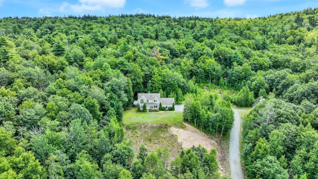 This Colonial residence is located high on the slope of New Ipswich Mountain at the end of a private, shared, gravel road, with a steep, paved driveway. The house site features a westerly 180 degree view, showcasing Mount Monadnock. 18.37 acres are part of the 700 acre conservation easement held by the New England Forestry Foundation, which includes a portion of the Wapack Trail. This 100+ year old trail summits mulitple peaks between Greenfield, NH and Ashby MA. Enter the house from the front porch, facing the view. Left is a an open concept living room with woodburning fireplace, dining area with sliders to a back deck and a wood cabinetted kitchen. Additional first floor room for a formal dining room, home office, or den. Half bath/laundry. Floors are wide oak or tile. Upstairs are the king sized primary suite with library nook, walk-in closet, private full bath and double window with...