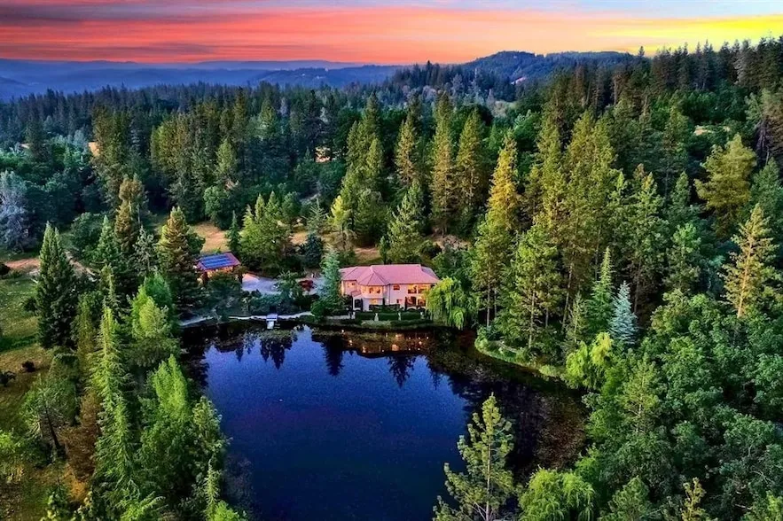 Introducing a stunning Mediterranean-style retreat nestled in the heart of 23.5 acres of natural beauty. Enter through the gates to this tranquil oasis and be greeted by a large pond brimming with bass, bluegill and a variety of magnificent wildlife. The main house is 3600+/- sf and boasts three master suites, each offering outside access for seamless integration with nature. Brazilian hardwood decks invite relaxation and elevate outdoor entertaining over a picturesque setting of the lovely pond. A charming, full studio guest house approximately 864+/- sf awaits above the workshop as well as a detached office with additional garage space below. Owned solar panels and 3 miners inches for irrigation supply ample water for the rhododendrons, crape myrtles, fruit-bearing trees and your own fenced-in garden. This unique property seamlessly blends the beauty of Mediterranean architecture with the splendor of its surroundings. Paradise awaits!