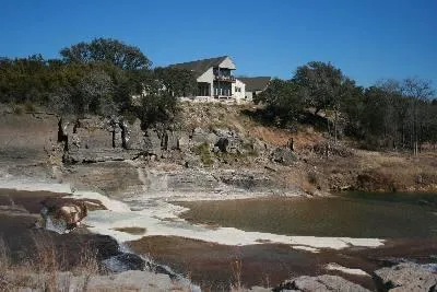 AN EXCEPTIONAL PROPERTY! 500' BOTH SIDES OF PEDERNALES RIVER. SHALLOW ROCK-BASE CRYSTAL CLEAR TO DEEP DARK WATERS, RUGGED HIGH BLUFF TO A GREAT WATERFALL, ONE OF THE PEDERNALES' BEST. LOVELY SPACIOUS COUNTRY-STYLE LIMESTONE/HARDIPLANK HOME SITS OVERLOOKING RIVER. HIGH PINE CEILINGS, HUGE DOUBLE-PLANE WINDOWS. LIVING W/BUILT- SURROUND SOUND, MASONRY FIREPLACE PLUMBED FOR GAS USE. KITCHEN HAS CYPRESS/STONE COUNTER TOPS. DBL GARAGE W/STORAGE & LOTS OF SPACE UPSTAIRS, ROUGHED-IN PLUMBING. WOODED & SEMI-PRIVATE. PAVED COUNTY ROAD FRONTAGE. A MUST-SEE PROPERTY!