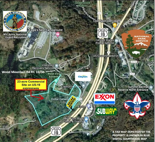 23-ACRE COMMERCIAL SITE ON U.S. 19 Adjoining the US-19 expressway in southern West Virginia, this 23-acre woodland tract with commercial-grade utilities boasts high visibility, high accessibility, and unmatched proximity to principal tourist attractions. More than 19,000 motor vehicles pass daily, including more than 3,000 trucks. Two million tourists visit the region annually, vacationing at the National Scout Reserve and the New River Gorge National Park and Preserve. The property shares utility infrastructure with the U.S. National Guard Armory and includes high-capacity water, sewerage, electric power, and priority road maintenance. Visitation is predicted to grow as the national park economy matures.