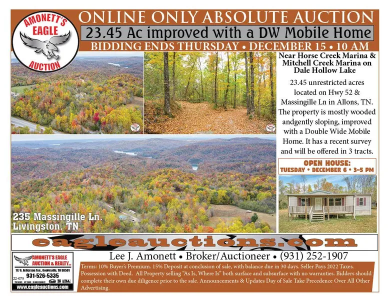 Near Horse Creek Marina & Mitchell Creek Marina on Dale Hollow Lake 23.45 unrestricted acres located on Hwy 52 & Massingille Ln in Allons, TN. The property is mostly wooded and gently sloping, improved with a Double Wide Mobile Home. It has a recent survey and will be offered in 3 tracts.