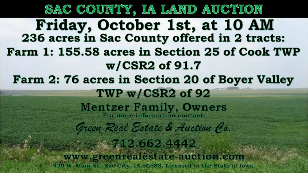 This sale provides an outstanding opportunity to acquire well located, highly productive Sac County farmland that would make a solid addition to an existing operation or an Ideal Investor Income type properties. Visit our website for more information and/or contact the Auctioneers