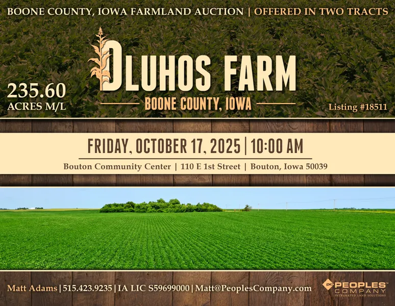 Boone County, Iowa Farmland Auction - Mark your calendar for Friday, October 17th, 2025 at 10 AM! Peoples Company is pleased to be representing the beneficiaries of the Margaret A. Dluhos Revocable Trust in the sale of their family farm located northwest of Woodward, Iowa, and northeast of Bouton, Iowa. The portfolio consists of 235.60 acres m/l and will be offered as two individual tracts. The tracts are located in Sections 26 & 27 of Peoples Township, Boone County, Iowa.